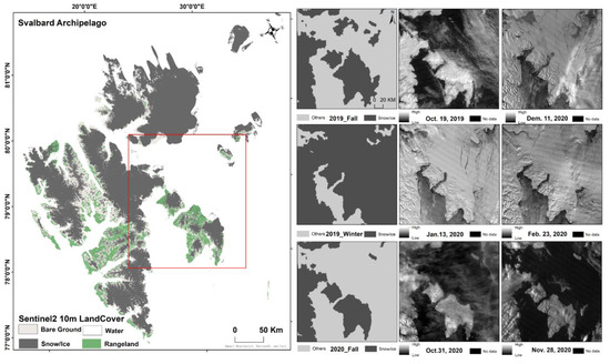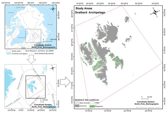 The study area, which covers a total of 318,141.00 km2 of land, includes Svalbard, Norway, and its surrounding seas. Svalbard is an archipelago in the Arctic region, located in the north of the European continent, about midway between the Norwegian mainland and the North Pole (Figure 2). The archipelago, which is north of the Arctic Research and Policy Act (ARPA) boundary area, covers a total area of 61,000 km2, of which 60.00% is glaciated and the remaining area is covered by barren rock and vegetation. The archipelago spans latitudes from 74.00° to 81.00°N and longitudes from 10.00° to 35.00°E. Due to its high latitude, the polar winter usually lasts from 84 to 128 days from October to March each year [50]. Svalbard is located within the Arctic Circle and is covered by snow/ice all year round, as well as experiencing long polar winter periods each year, making it an ideal study area. In addition, we included the surrounding marine areas around the Svalbard archipelago to explore the floating ice changes.