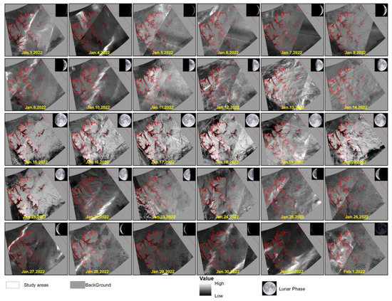 Moonlight remote sensing [47] has huge potential in detecting polar snow/ice cover [48,62,63], and is first used to observe snow/ice, first demonstrated by studies using Defense Meteorological Satellite Program/Operational Line-Scan System (DMSP/OLS) remote sensing [64,65]. Recently, studies with VIIRS/DNB images [49,66] and multi-spectral photos taken by astronauts from the International Space Station (ISS) [47] obtained between the first quarter and third quarter moon, and above the horizon also further confirmed that. Although our work implemented a practical framework for applying time series of moonlight remote sensing data to monitor polar snow/ice spatiotemporal dynamics during polar night periods for the first time, the application of moonlight remote sensing data in extracting snow and ice dynamics over shorter time scales has not been discussed. Additionally, with this aim, three scenes of moonlight images are used to classify the snow/ice, with accuracies over 75.00% (Table 2). However, we find that cloud cover is a major limitation for using moonlight remote sensing to extract the intra-month dynamics of snow cover (Figure 13).