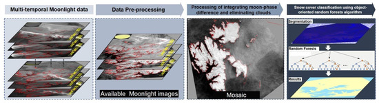 This study was mainly divided into three parts: data pre-processing, the processing of integrating moon phase difference and eliminating clouds and aurora cover, and snow/ice cover classification based on the object-oriented random forests (RF) algorithm (Figure 4).