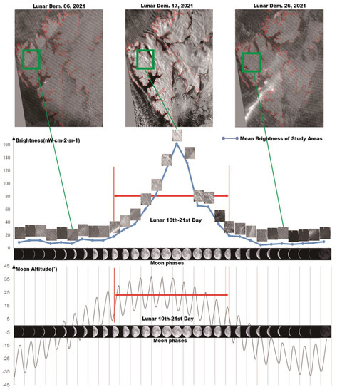 Due to the limitations in both moon phase shifting and remote sensor minimum detection sensitivity, not all moonlight remote sensing data could be used. The data brightness value varied periodically during a full Lunar month, with the maximum brightness value under the full moon. We analyzed the entire polar winter data and found the applicable data that between the first quarter and third quarter moon, and moon altitude was over the horizon in Figure 5. Since the VIIRS/NDB data was obtained at 1:30 local time, if the moon phase angle at around 1:30 was below the horizon the data was also deleted.