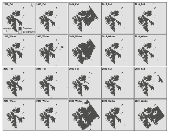 We extracted and mapped the snow/ice covers from 2012 to 2021 during the whole polar winter periods (both astronomical fall and winter seasons in the Northern Hemisphere) as shown in Figure 8. During the entire polar night period, we find in the astronomical fall of 2014, 2017, and 2021, snow/ice covers increased the areas by 47,145.59, 117,713.51, and 19,314.45 km2 in the astronomical winter of the previous year, respectively. And the snow/ice covering the area in 2019 is the largest in the ten years during polar night periods.
