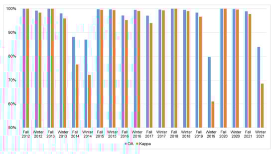 The snow/ice cover classification accuracy is shown in Figure 10, with the highest classification accuracy being 100.00% in the fall of 2012, 2013, 2018, and 2020. The lowest classification accuracy is 79.75%, and the kappa coefficient is below 0.7 in the winter of 2019. Overall, the moonlight remote sensing images can be used to map the snow/ice cover, with a 96.27% average accuracy and a 0.93 kappa coefficient, respectively.