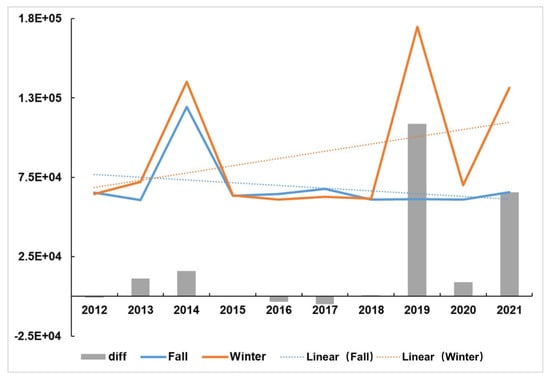 The temporal change in the snow/ice cover areas is shown in Figure 11. The smallest snow/ice cover of 60,708.98 km2 occurred in the fall of 2013, with the largest area of snow/ice cover occurring in the winter of 2019, covering an area of 169,739.80 km2, and this is also the year of the greatest difference in snow/ice coverage during the autumn and winter. Overall, the snow/ice cover in winter will be larger than that in autumn. In addition, the difference between snow/ice gradually increasing throughout the year and the overall snow/ice cover for 2012–2021 shows a downward trend in fall and an upward trend in winter.