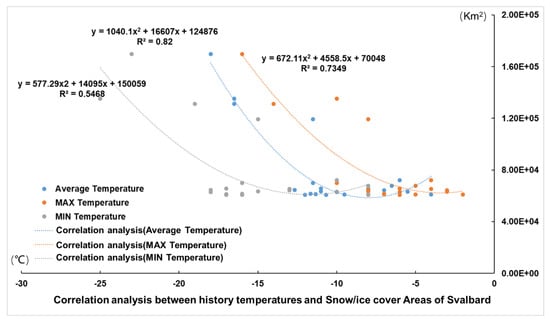 Finally, we explored the relationship between historical temperatures (Average/MAX/MIN) and snow/ice cover areas of Svalbard, Arctic region (Figure 12). We find that the snow/ice coverage area and temperature of the Arctic have a strong correlation. R2 is equal to 0.73, 0.82, and 0.54, respectively. All curve lines on the figure show that as the temperature rose, the area of the snow/ice decreased.