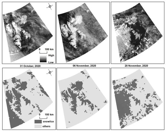 Snow/ice cover consists of the precipitation that results from the freezing of water vapor. Due to its highly reflective properties, it is an extremely important component of the Earth’s climate system, affecting the energy balance, atmospheric and oceanic cycles, ecology, and natural resources, reflecting incoming sunlight into space, and cooling the Earth [1]. As one vital freshwater resource, the area of permanent snow/ice cover on Earth covers approximately 11.00% of the land area, and the total area covered by snow/ice is 23.00% of Earth’s surface area yearly [2,3]. However, snow/ice cover has experienced more serious melting with global warming in recent years [4,5,6,7], especially in the high-latitude Polar regions. It has been found that Arctic snow/ice is melting faster than expected [8], and one-third of the polar ice caps have been reduced since the first related studies began in 1979 [9]. Therefore, it is urgent to monitor polar snow/ice cover changes with more spatiotemporal details to analyze and predict global climate change, and assess the impacts of global climate change on polar snow/ice.