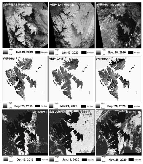 In this study, we have discussed the difference between moonlight remote sensing images and other types of optical remote sensing images (Figure 14). Compared with moonlight remote sensing images, the availability of VNP10A1F data is limited [29]. There are only 30 scenes imaged during the polar night period from 2019 to 2020, and the dataset acquisition dates are 23 September 2019–6 October, 9 March 2020–21 March 2020, and 24 September 2020–6 October 2020, respectively. Furthermore, the available images were obtained at the beginning or the end of the polar night period, or under sunlight conditions over the Svalbard archipelago. Therefore, these VNP10A1F data cannot be applied to the entire extreme night period, especially under a faint light environment. On the other hand, although the MDY29P1N [26] dataset has a large amount of data during the polar night period, the spatiotemporal quality of the products is relatively poor, and they cannot be used for snow/ice monitoring, especially in Svalbard’s surrounding seas.