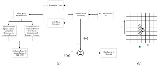 The property of sea clutter propagation in the spatial-temporal domain makes it possible to reconstruct and estimate the sea clutter through the inherent dynamics model shown in Figure 4. Figure 4a is the framework of the proposed algorithm. Firstly, the infrared sea clutter data is normalized to the original serial data. Then, the temporal dynamics reconstruction function and the spatial dynamics reconstruction function are built based on these extracted dynamical parameters from the original serial data. Afterwards, the space-time coupling coefficient and the spatiotemporal dynamics reconstruction function are estimated using RBF-ANN to estimate the sea clutter. Finally, the sea clutter is suppressed by subtracting the estimated image from the original image, and then the target is detected in the suppressed image. To make the model easier to understand, Figure 4b simply shows the directions of the temporal domain and the spatial domain in phase space.
