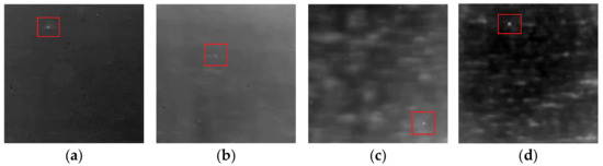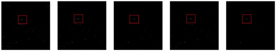 Figure 7 shows four infrared sea clutter image sequences with various fluctuations in the experiments, and the small targets are highlighted with red rectangles. Each infrared sequence has 50 images. The size of each image is 256 × 256 pixels, and the depth is 8 bits. In Figure 7a–d, the fluctuation of sea clutter becomes stronger. There is little fluctuation in Figure 7a, the sea clutter fluctuates weakly in Figure 7b, and the crests and troughs are obvious in Figure 7c,d. Their signals-to-clutter ratios (SCRs) are 2.94, 2.52, 1.58, and 0.88, respectively. Although the target in Figure 7d is brighter than in Figure 7b, the former’s SCR is smaller than that of the latter.