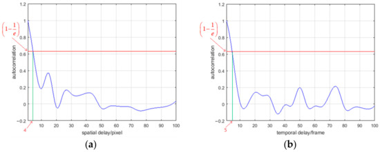 To simplify the description of the experiment, only the sea clutter image in Figure 7d is used to verify its dynamics in the spatiotemporal domain. The spatial autocorrelation function and the temporal autocorrelation function are shown in Figure 8. The spatial delay time and the temporal delay time are 4 pixels and 5 frames, respectively.