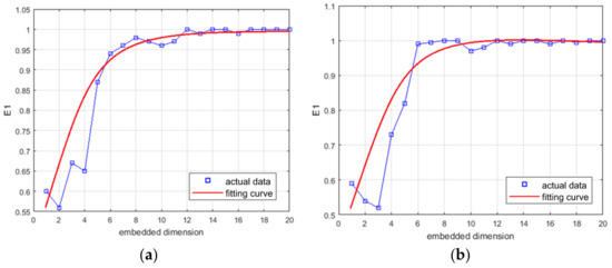 Figure 9 shows the function on the spatial embedded dimension and the temporal embedded dimension. and the fitting curve increase with the increase in the embedded dimension. In the early stages of growth, the growth rate of the curve, namely the slope, is very large. When the embedded dimension increases to a certain extent, the growth rate will slow down to zero. Therefore, the actual embedded dimension is determined when the growth rate is lower than 10% for the first time. In Figure 9, the spatial embedded dimension and the temporal embedded dimension are equal to 7 and 6, respectively.