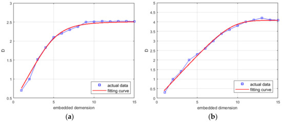 Moreover, the associated dimension is also a significant parameter to determine whether the serial data is dynamical or not. It usually increases with the increase in the embedded dimension . For dynamical serial data, when it increases to a certain extent, it becomes saturated. Conversely, if the serial data is random, the correlation dimension would not be saturated. The relevant dimension is denoted by