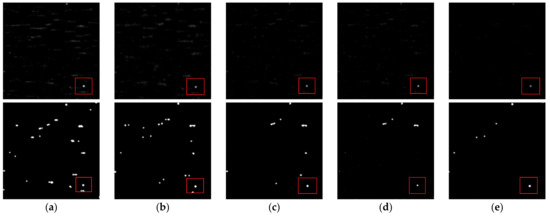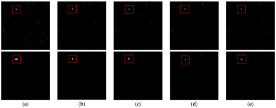 In addition, for these four sea clutter image sequences with various fluctuations, the residual images and the detected images are shown in turn in Figure 12, Figure 13 and Figure 14, and the first row and the second row are the residual images and the detected images, respectively. The small target in each image is heighted with red box. The structure element of the top-hat algorithm is 5 × 5 pixels. In the case of smooth sea clutter, shown in Figure 12, these five algorithms could accurately estimate the sea clutter and effectively detect the small target.