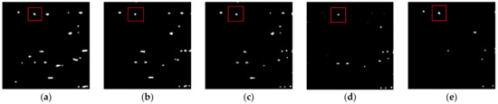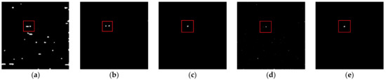 In the case of weak fluctuation, as shown in Figure 13, the residual image processed by top-hat has some big errors at the edge of the crest, and the binary image also has false alarms consistent with the wave direction. Instead, the residual images processed by the other four algorithms have no obvious remnants, and the target was also detected effectively. Moreover, the residual in the proposed algorithm is a little more serious than that of the other three dynamical algorithms.