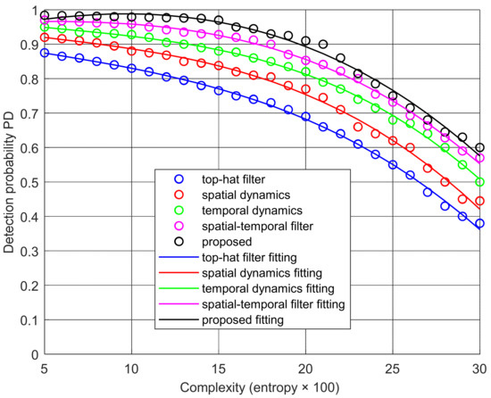 The estimation error under various fluctuations is shown in Figure 16, in which the entropy of the whole image is adopted to represent the degree of sea clutter fluctuation. The estimation error is normalized to 0.3, and it increases with the increase in fluctuations in evidence. The error of the proposed algorithm is the smallest, and it is only half that of spatial dynamics when the complexity is 5 to 20. The entropies of the four infrared image sequences are 0.08, 0.14, 0.22, and 0.3, and their SCRs are 2.94, 2.52, 1.58, and 0.88, respectively.