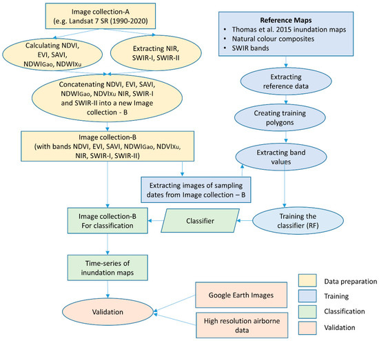Inundation maps developed by Thomas et al. [13] were used as a reference dataset in collecting training samples and for validation of the results. Note that the mapping algorithm by Thomas et al. [13] was adapted to develop the wetland inundation maps by the DPIE from 2014 to 2019 using Landsat data. Here, NDWIXu masked by the sum of bands 4, 5, and 7 (sum457) was used to detect water and mixed pixels. Vegetation was classified using an unsupervised classification of a composite image comprising two dates representing vegetation senescence and green growth, transformed into two contrasting vegetation indices, NDVI and NDIB7/B4.