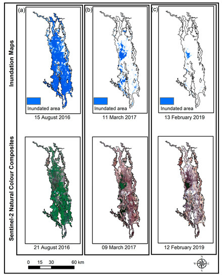 A comparison of the inundation maps of three inundation scenarios derived from Landsat 8 on (a) 15 August 2016, (b) 11 March 2017, and (c) 12 February 2019 with Sentinel-2 derived natural colour composites of the closest available cloud-free dates.