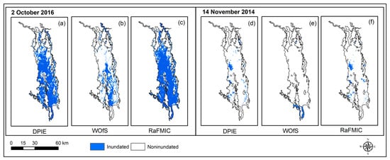Figure 5 shows a comparison between inundation maps of surface water mapped by the DPIE, DEA WOfS and RaFMIC created at two inundation scenarios. A larger extent of inundation was observed on 2 October 2016 than on 14 November 2014. It is evident that there is a good agreement between the wetland inundation maps developed by the DPIE and the results of the RaFMIC method. The WOfS dataset has not captured the detailed wetland inundation of this area (Figure 5b,e), especially over the Northern Marshes where frequent inundation takes place. Similarly, the European Commission’s global surface water mapping project (https://global-surface-water.appspot.com, accessed on 15 December 2020) also could not capture wetland inundation in detail. It is noteworthy to mention that the WOfs and European Commission’s global surface water datasets were developed mainly with the aim of providing continental- and global-scale ‘open surface water’ dynamics, respectively, but these products might not always be successful in mapping complex wetland inundation dynamics with mixed responses from vegetation and dissolved matter [30].