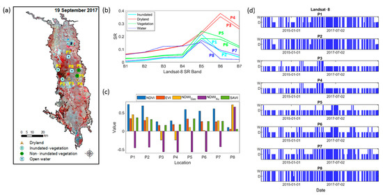 Point signatures and inundation dynamics of four land use classes over the study area. (a) Locations of eight points over the Landsat 8, 5-4-3 composite on 19 September 2017; (b) spectral signatures of the eight points extracted from Landsat 8 image; (c) index values of NDVI, EVI, NDWIGao, NDWIXu, and SAVI of the eight points extracted from the Landsat 8 image; and (d) the inundation time-series of the eight points (here, W is wet and D is dry). Here, P1 and P2 are inundated vegetation, P3 and P4 are dryland, P5 and P6 are noninundated vegetation, and P7 (river) and P8 (water body) are open water.