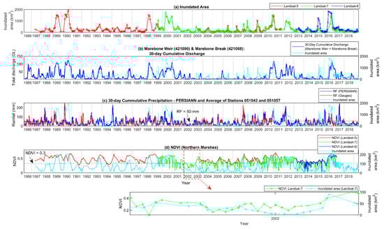 (a) Inundated area within Macquarie Marshes as captured by the Landsat 5-, 7-, and 8-based inundation maps; (b) 30-day cumulative discharge at Marebone Weir and Marebone Break (# 421,090 and # 421088); (c) 30-day cumulative precipitation across the study area captured by PERSIANN data and rainfall stations (# 051042 and # 051057) with inundated area; and (d) average NDVI over the northern Marshes with inundated area as captured by the Landsat 5-, 7-, and 8-based products.