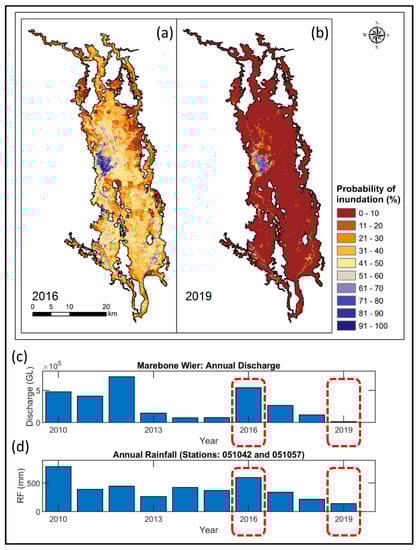 Figure 9a,b show wet and dry year inundation dynamics captured by RaFMIC. The year 2019 was the driest and warmest year on record for NSW, while 2016 was classified as a wet and warm year in NSW [91]. Both annual discharge data from the inlet to the Marshes (i.e., Marebone Weir station) (Figure 9c) and annual rainfall data from the weather stations # 051042 and # 051057 (Figure 9d) confirm 2016 as a wet year (i.e., with the total rainfall and annual discharge much higher than the overall mean) and 2019 as a dry year (i.e., less than mean annual precipitation and stream discharge). These wet and dry conditions are evident in the probability of inundation calculated by the Landsat 8-based inundation maps available in 2016 and 2019, respectively (Figure 9a,b). Figure 9a shows a mean inundation probability of 34% with a standard deviation of 17% in 2016, whereas Figure 9b shows a mean of 3% with a standard deviation of 3% in 2019. In 2016, 1314 km2 (i.e., ~66% of the entire Marshes area) had an inundation probability of over 25%, whereas in 2019, this value reduces to 74 km2 (i.e., ~4% of the entire Marshes area).