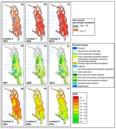 Figure 10 shows a comparison between the vegetation mapping carried out in 1991, 2008, and 2013 [83] with the inundation maps. The inundation probability (Figure 10a–c) was calculated based on the inundation maps of four months, prior to the airborne data collections conducted for vegetation mapping. Landsat derived mean NDVI maps for these periods are shown in Figure 10g–i. A good agreement can be seen between the frequently inundated area (for both dry and wet conditions shown in Figure 10a–c) with river red gum woodland and forest (Figure 10d–f). An intrusion of invasive vegetation into the semipermanent wetlands can be seen in 2008, reducing the spatial extent of semi-permanent wetlands (Figure 10e). A low inundation probability can be observed in 2008 (mean areal probability=11.6%, Figure 10a) compared to 1991 (mean areal probability=19.4%, Figure 10b). However, a re-expansion of semipermanent wetlands can be observed over the Northern Marshes by 2013 (Figure 10f), probably as a response to flood events over the area which occurred between 2010 and 2012 (Figure 10c).