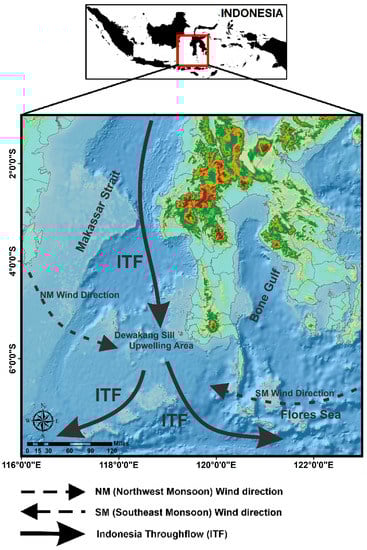 The map of the study area, illustrating the major environmental characteristics of Indonesia Fisheries Management Area (IFMA) 713 (1–8°S and 116–123°E).
