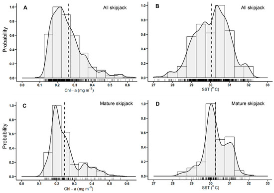 Probability density distribution of SST (A) and Chl-a (B) estimated from Aqua/MODIS for all skipjack catches (n = 1248) and that of SST (C) and Chl-a (D) for commercial (mature) skipjack tuna (n = 333) caught in the study area (IFMA 713) from 2007 to 2016. The vertical dash line indicates the average of the data.