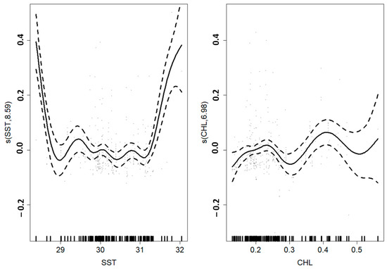 Using the GAM, the Gaussian family, linked to the identity link function, was selected because the CPUE has a continuous distribution. To normalize the asymmetrical distribution, we applied a logarithmic transformation to CPUEs [40]. The predicted skipjack CPUEs from the explanatory variables were significant, with 30.3% cumulative deviance explained (CDE) (Table 2). All predictors (SST and Chl-a) were statistically significant (p < 0.01). It is important to note that these environmental parameters greatly contributed to describing the real variability of commercial skipjack tuna habitats. From the model, the strongest effect of SST on CPUE occurred from 29.5 to 31 °C. The significant effect of Chl-a on skipjack abundance ranged from 0.15 to 0.28 mg m−3 (Figure 3). The preferred SST described 79.11% of total mature tuna catches. In contrast, the favorable Chl-a accounted for 79.20% of the commercial skipjack CPUEs. All of these signatures can be used as strong indicators of skipjack habitat hotspots.