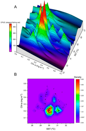 The results obtained above are further reinforced by comparisons of the predicted skipjack CPUE with concurrent ocean color (Chl-a) and thermal (SST) signatures using 3D catch–oceanographic relationships for the period of 2007–2016 (Figure 4A). The highest CPUEs (more than 300 fish/fishing set) were localized between 0.1 and 0.3 mg m−3 for surface Chl-a and peaked at around 0.2 mg m−3. The range of temperatures where SST and CPUE were most strongly correlated was 29.5 to 31.5 °C, with 30 °C being the habitat of choice. Using KDE, the highest density of fishing sets occurred in areas with a Chl-a of 0.15–0.3 mg m−3 and an SST of 29.5–30.5 °C, centered at 0.2 mg m−3 and 30 °C, respectively (Figure 4B).
