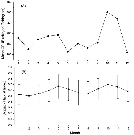 Temporal variability of mean skipjack CPUE (A) and skipjack habitat index/SHI (B) from January to December 2007–2016.