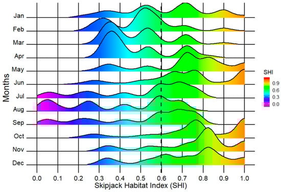 It is important to highlight that with a chlorophyll indicator value of 0.2 mg m−3, the important skipjack habitats can be located spatially and temporally year-round (Figure 5). In areas with greater SHI values and CPUEs, the locations of the chlorophyll front matched up well (Figure 3, Figure 4 and Figure 5). Interestingly, these areas were primarily discovered within areas with preferable SST. Most potential skipjack fishing sites with densities of reliable SHI (above 90%) were found in October (Figure 6 and Figure 7). This fact demonstrates how the increase in CPUE in that month and the high SHI are clearly associated. Conversely, the low SHI between July and September also matches the decrease in catches (Figure 4, Figure 5 and Figure 6). The temporal variability of SHI indicated that an SHI of more than 75% occurred in two phases: (1) during May–June and (2) in the period of October–December (Figure 7).