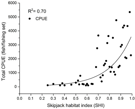 Based on the decade of satellite environmental data for fisheries in 2007–2016, it was found that there was a statistically significant correlation between total CPUE and the skipjack habitat index (p < 0.001) (Figure 8). This relationship could be expressed exponentially by the equation Y = 15.191e5.639x with R2 = 0.70, where Y is the total CPUE and X is the skipjack hotspot habitat index (SHI). The increase in the habitat index for skipjack tuna tended to be followed by a significant increase in total CPUE, particularly starting from an SHI value of 0.60. The model accuracy assessment showed that the SHI values from January to December could explain 70% of the variability of total catches.