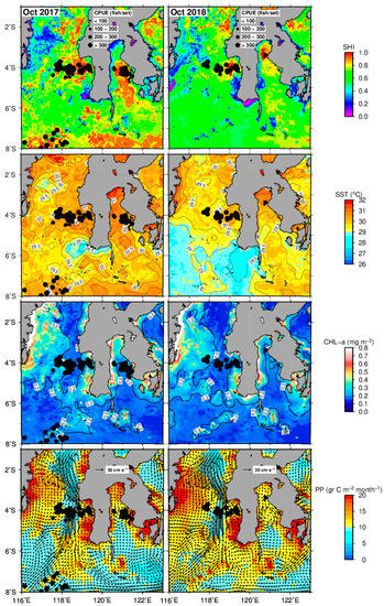 The spatial distribution of observed skipjack tuna CPUEs overlaid on predicted habitat hotspots and multiple environmental habitat characteristics are shown in Figure 9. The model’s accuracy was evaluated using 116 untrained CPUE data sets from 2017 to 2018 that were not included in the spatial model analysis. Cross-validation data both in October 2017 and 2018 showed that tuna fishing points were concentrated in areas with a surface Chl-a concentration near 0.2 mg m−3 (the indication for a Chl-a front), an SST about 30–31 °C and a relatively high primary production (more than 10 gr C m−2 month−1). The biologically rich areas were also associated mainly with the convergent current and temporary anticyclonic eddy circulation in the waters of 4–5°S and 118–119°E. Greater CPUEs were mainly found near the peripheral areas of the eddy field and were closely correlated with the higher SHI, which defined the significant skipjack habitat hotspots, suggesting that the SHI was derived and confirmed by the fishing data. The quantitative cross-validation showed that the average CPUEs increase with increasing SHI (Table 3).