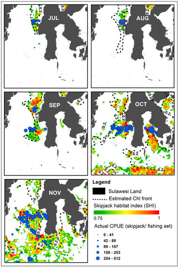 - Zainuddin, M.; Farhum, A.; Safruddin, S.; Selamat, M.B.; Sudirman, S.; Nurdin, N.; Syamsuddin, M.; Ridwan, M.; Saitoh, S.-I. Detection of Pelagic Habitat Hotspots for Skipjack Tuna in the Gulf of Bone-Flores Sea, Southwestern Coral Triangle Tuna, Indonesia. PLoS ONE 2017, 12, e0185601. [Google Scholar] [CrossRef]