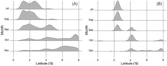 Spatial and temporal movement of estimated SHI ≥ 0.75 from the model (A) and the density of observed skipjack fishery data (B).