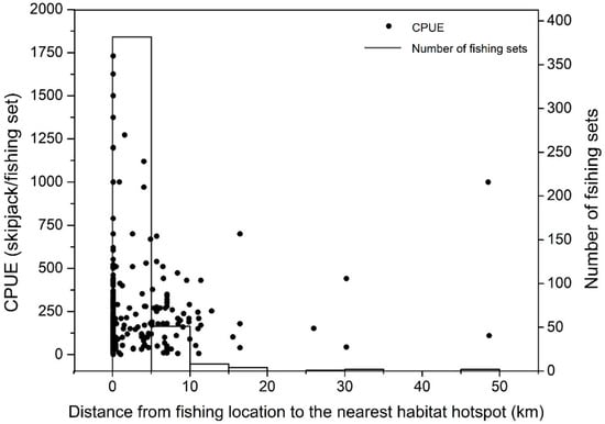 The skipjack fisheries were distributed within 10 km of the hotspot areas (Figure 12). Skipjack CPUE was specifically higher near the center of the habitat hotspot, i.e., Chl-a fronts (Figure 4 and Figure 10), with the mean CPUE being about 195 fish per fishing set within 5 km of the key habitat and less than 50% of that elsewhere (Figure 12). Skipjack fishermen in the study area apparently took a favorable position with regard to this association by fishing near as possible to the fronts, with 85% of their effort concentrated within 0–5 km of the fronts (Figure 12).