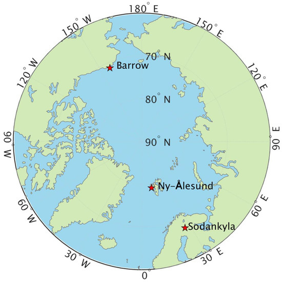 The GRUAN radiosonde stations in the Arctic. The red stars denote the locations of the sites.