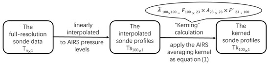 These trapezoid functions define the upper and lower bounds for which the retrieved layer quantities of water vapor, atmospheric temperature, and trace gases are defined [32]. In AIRS v7, the number of temperature retrieval trapezoids was increased in the boundary layer and the tropopause, which were made more uniform vertically, leading to a better representation and stability of the retrieval. The size of the trapezoid matrix is based on the number of pressure levels in the AIRS retrievals, and its setting was described by Susskind et al. (2003) [27]. The specific process of kerned sonde profile producing is shown in Figure 2.