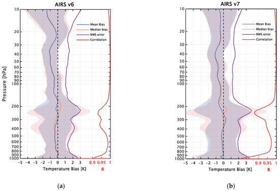 The retrievals at different atmospheric levels are evaluated using several validation statistics, as shown in Figure 3: the mean bias, root mean square error, correlation coefficient, and standard deviation. Generally, AIRS v6 and v7 agree well with the sonde profiles with near-zero cold biases (−0.5–0 K) at nearly all individual levels below 150 hPa, and the mean bias averaged over all levels slightly decreased from −0.4 K in v6 to −0.3 K in v7. The median biases for v6 and v7 are close to the mean biases at most levels, indicating that the calculated cold biases are robust to statistical assumptions, except for the warm biases at several levels near the tropopause (160–250 hPa). The averaged RMS error (standard deviation) increased from 1.6 K (1.7 K) to 1.9 K (2.0 K). The range of the minimum and maximum RMS error values remained low in v6, equal to 1.0 K and 4.8 K, relative to those in v7 (1.2 K and 5.8 K, respectively). There are two peaks in the RMS error center at 391 hPa and 223 hPa for AIRS v6 and v7, respectively. The RMS errors increase gradually with height during the whole year from 600 hPa to 400 hPa, leading to a minor peak surpassing 2 K at 400 hPa. Subsequently, there is a slight decrease in the RMSE profile until sharp vertical gradients occur near the tropopause below 200 hPa (3.0 K and 3.5 K for v6 and v7, respectively). The large RMS may reflect the AIRS observation’s inability to capture sharply changing temperature gradients and inappropriate channel selection around the tropopause [55].