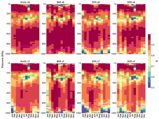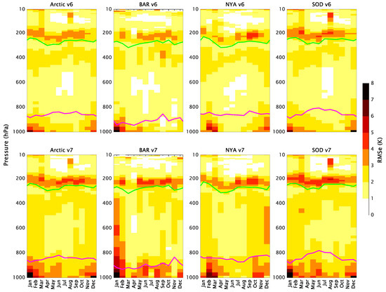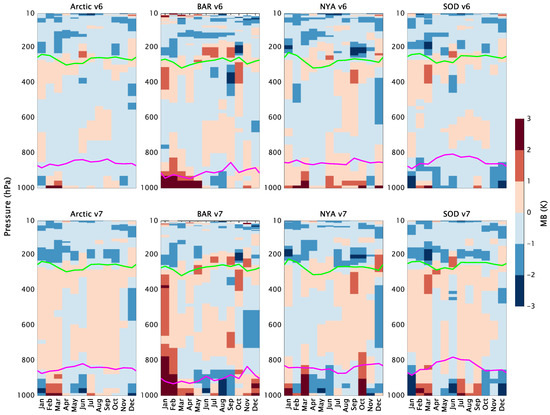 Seasonal variation in the mean bias profiles for AIRS v6 and v7 and the 3 GRUAN Arctic sites and their average using data from 2012 to 2016. Data are grouped into 12 bins, and the results are presented as a function of pressure at each bin’s center point. The green and magenta lines show the pressure of the tropopause and boundary layer top estimated from AIRS retrievals, respectively. The result is statistically significant (t-test, p < 0.05).