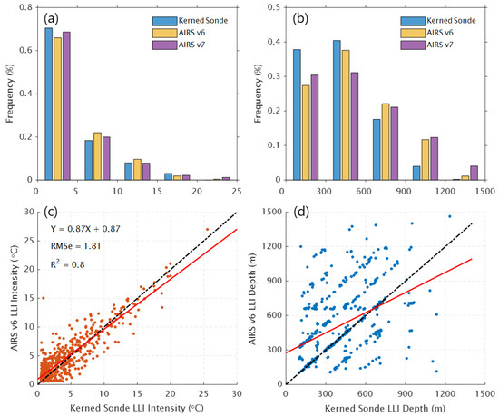 Comparisons of LLI depths and intensities. The frequency distributions of LLI intensity and depth are shown in panels (a,b) using bin sizes of 5 °C and 300 m, respectively. The correlations of LLI intensities and depths between the AIRS v6 and kerned sonde profiles are shown in panels (c,d). The identity (1:1) line is shown in a black chain line, and a line representing linear regression is shown in red. Regression statistics are also shown.