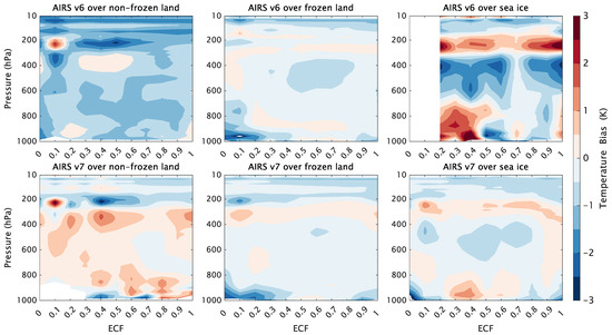 The bias in the AIRS temperature profiles was primarily related to the surface type and cloud fraction. In clear-sky conditions, the cases over nonfrozen land are close to the AIRS accuracy goal, whereas there is significant degradation over frozen land and sea ice. The AIRS v7 algorithm is based on cloud clearing as in previous versions, setting a typical threshold on the high side so that many thin cirrus clouds or shallow and broken cumulus clouds are removed. In turn, more clouds retain a lower threshold but more spurious clouds are included. AIRS cloud detection typically struggles to quantify thin cirrus clouds, and spurious cirrus clouds can occasionally appear near the tropopause and low cloud layers, which are associated with an effective cloud fraction (ECF) < 0.05 [57]. Nalli et al. (2012, 2013) illustrated that the residual cloud and aerosol contamination remaining in clear-sky window radiances could have a measurable impact on the angular agreement and lead to a cold-biased observation [58,59].