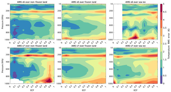 The vertical bias oscillations are generally independent of cloud fraction, excluding the bias of v6 over sea ice, which increases with ECF when ECF > 0.8; whichthis has been partly removed in v7. In contrast, the accuracy degradation with increasing cloud cover is evident in the RMSE at most levels. On average, the RMS differences with 100% cloud cover are approximately 1.5~2.0 K larger than those for clear cases, varying sharply in the middle and lower troposphere (below 400 hPa). Below 700 hPa, the cases flagged as acceptable fall slowly with increasing cloud cover, from approximately 67% at low cloud fractions to 27% close to 1.0 ECF. The ECF and accuracy of the AIRS temperature profiles are also highly dependent on the cloud state, and AIRS retrieval yields range from values surpassing 90% for clear skies to values less than 10% for deep convection and nimbostratus [60]. Thus, the typical decrease in the retrieval yield near the surface is probably due to the ubiquitous presence of low-level clouds, which are more frequent in summer melt over the Arctic Ocean [61,62].