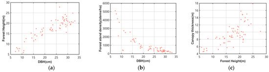 Relationship between the forest structure parameters at the plot level. (a) Mean DBH vs. mean tree height, (b) mean DBH vs. forest stand density and (c) mean tree height vs. mean canopy thickness.