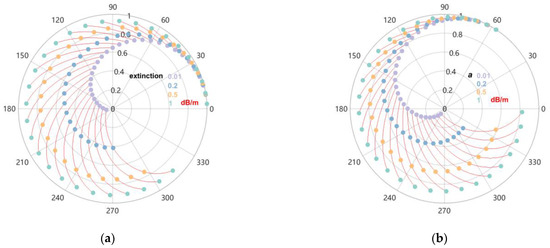 Volume coherence and interference phase plots obtained for different extinction coefficients. (a) Volume coherence and height diagram with different extinction coefficients. (b) Interference phase and height diagram with different extinction coefficients. The fixed extinction coefficients (0.01 and 1 dB/m) are represented by black dots, and the extinction coefficient influence factors (0.01, 0.2, 0.5 and 1 dB/m) are represented in blue, green, yellow and red, respectively.