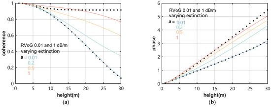 The constant extinction coefficient RVoG model and the variable extinction coefficient semi-empirical improved RVoG model were used to build the LUTs, which are shown in Figure 8a,b, respectively. We observed that when the extinction coefficient is zero, the impact of volume decorrelation is the most significant, because the scatterers distributed throughout the forest height interval contribute the same intensity and the radial position of the interference position is closest to the triangle of the circle center. When the extinction coefficient is large or the ground scattering is strong, the volume complex coherence amplitude easily becomes saturated, but the phase is not saturated (green curve). With the highest extinction coefficient is the highest, the smallest volume decorrelation, and largest phase center height. The volume coherence of the extinction coefficient in the range of 0–1 dB/m (red curve) varies with . When the forest height is the same, the scattering amplitude of volume complex coherence is larger due to the strong surface scattering or vegetation attenuation, and volume decorrelation causes the complex coherence to decrease with the increasing vegetation height. Therefore, the increase in the extinction coefficient affects the volume decorrelation and phase center. The interference coherence of the varying extinction volume at low heights is close to the constant zero extinction random volume, the total change in the volume of the average extinction coefficient is lower, and the difference between the various extinction change rates becomes more significant with the increasing forest height. Furthermore, compared with the complex coherence obtained by constant extinction coefficient, it was found that the complex coherence obtained by varying the extinction coefficient simultaneously affects the phase center and coherence by introducing the temporal decorrelation correction factor. Figure 9 shows the coherence and phase of the extinction volume variation with height, where the linear variation in the coherence and phase at a constant extinction (0.01 and 1 dB/m) yield random volume boundaries. Comparing the coherence and phase variations obtained by the fixed extinction coefficient and extinction coefficient influence factor, it was found that the lowest and highest extinction coefficient influence factors are close to the properties of the constant extinction random volume model, and high extinction results in less volume decorrelation and a higher phase center height than low extinction.