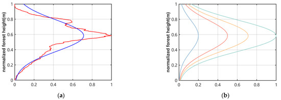 (a): Vertical reflectance profile fitted by the InSAR phase center height histogram and Gaussian function. The histogram reflecting the vertical reflectance profile is red, and the vertical reflectance profile obtained by Gaussian function fitting is blue. The vertical axis shows the normalization of the forest heights ranging from 0 to 1 m. (b): Change in the magnitude of the influence factor for different extinction coefficients, which determine the shape of the curve. The curves of 0.2, 0.5 and 1 for are indicated in blue, red and green, respectively, and the value obtained by fitting the Gaussian function is yellow.