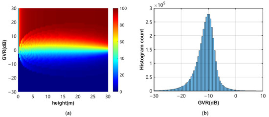 Zero GVR assumes ambiguity space in the calculation of volume-only coherence, especially in the case of sparse forest areas, since the contributions of volume and ground scattering are mixed in all polarization channels. Through the use of simulation experiments, the RVoG model was used to illustrate the degree sensitivity of the forest height to the GVR. In order to quantitatively analyze the forest height bias, the assumption of zero GVR was made for the forest height in the range of 0–30 m based on a GVR range from −30 dB to 30 dB. The simulation results show (Figure 13a) that when the GVR is less than −10 dB, the forest height is highly underestimated by 10%. The bias increases significantly as the GVR increases. The error is approximately 50% when the GVR approaches 0 dB, and the inversion of the forest height practically fails when the GVR exceeds 0 dB. Therefore, to ensure a certain level of accuracy in the estimation, the GVR should be lower than −10 dB. The improved GVR adopts the double-bounce and volume scatter as the scattering contribution of the volume layer, which enables one to avoid the error caused by the overestimation of the GVR in sparse vegetation areas. In general, the improved method can reduce the magnitude of the GVR, but it is still difficult to ensure that every GVR is below −10 dB (Figure 13b).
