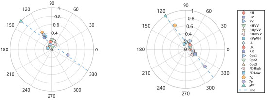 Fifteen common complex coherences (HH, HV, VV, HHVV, HH + VV, HH − VV, HV + VH, LL, LR, RR, Opt1, Opt2, Opt3, PD High, PD Low) and the complex coherences (, ) obtained in this study were used for the comparison of GVR at low and high forest stand densities. Left: low density; right: high density.
