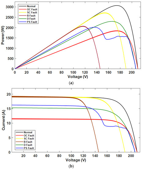 PV systems are commonly affected by several electrical defects induced by several irregularities in the configuration of PV arrays [14]. As seen in Figure 3a, when a fault happens among PV panels, the power output from the array varies widely, even though the operational characteristics of a single PV panel do not differ substantially. Figure 3a shows the power-voltage characteristic curves under the normal and faulty scenarios, while Figure 3b shows the current-voltage characteristic curves under the normal and faulty scenarios. The short-circuit current will drop significantly if a PV array experiences an open circuit fault. When a short-circuit fault occurs, the open-circuit voltage declines significantly. The consequences of bridge fault are a reduction in open circuit voltage and a smaller decrease in the short-circuit current of PV arrays. The P-V and I-V operating curves behave differently under partial shading fault conditions. The open circuit voltage gradually reduces; however, a tremendous decrease is observed in the short-circuit current experience during partial shading fault. Compared to the typical PV array operation, the degrading fault causes a reduction in the maximum current and voltage; however, no changes have been observed in the PV array’s open-circuit voltage or short-circuit current.